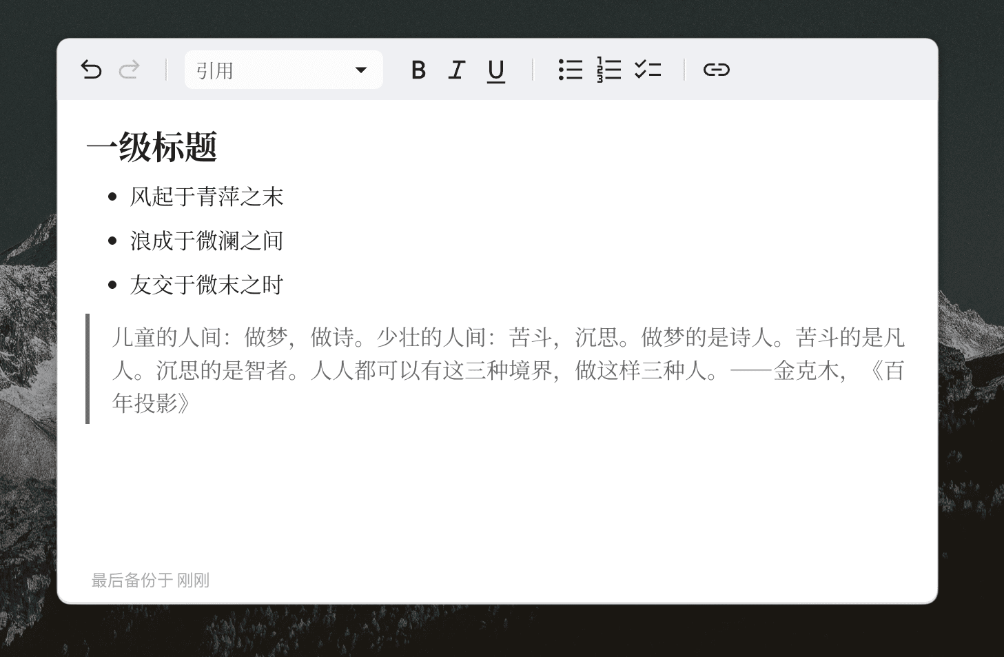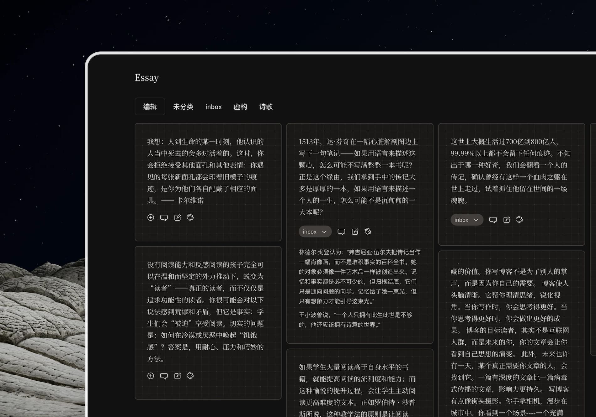 在一个写作社区上线笔记的目的是什么呢?我们清楚真正的写作本就是一场思维的拓扑学, Essay 的[笔记]是一个思想的容器,也是一张画布,目的是帮助用户组织网状的思考,并最终将其展现在线性的文字中。