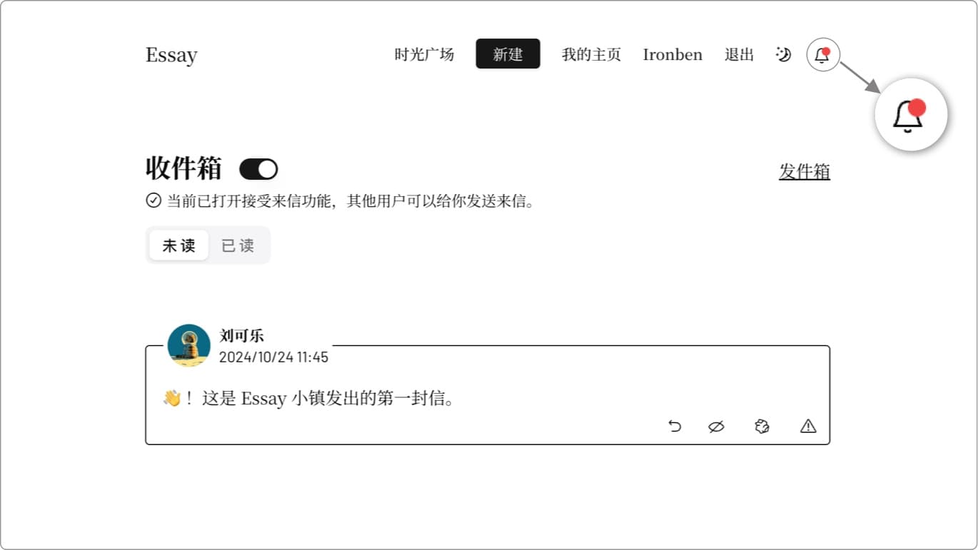 现在你可以在收件箱中开启【接受来信】,开启后在你的个人主页和文章中将会显示邮件图标,其他用户将可以给你发送信件。