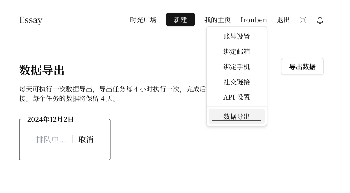 现在点击右上方的用户名,即可在弹出的菜单中看到“数据导出”。目前每天每位用户可执行一次数据导出,导出任务每 4 小时执行一次(所以任务提交后需要稍作等待),完成后会显示文件下载链接。每个任务的数据将保留 4 天。