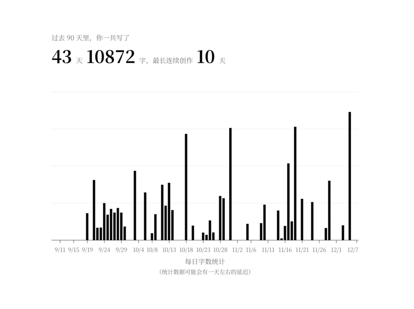 增统计功能旨在反映近期写作状态,希望能带来一些成就感和鼓励。但如果没啥数据也不必在意,写作本身是一件轻松的事,别太纠结于冷冰冰的数字,想写就写,不想写就不写,不要让数据成为写作目的,徒增压力。