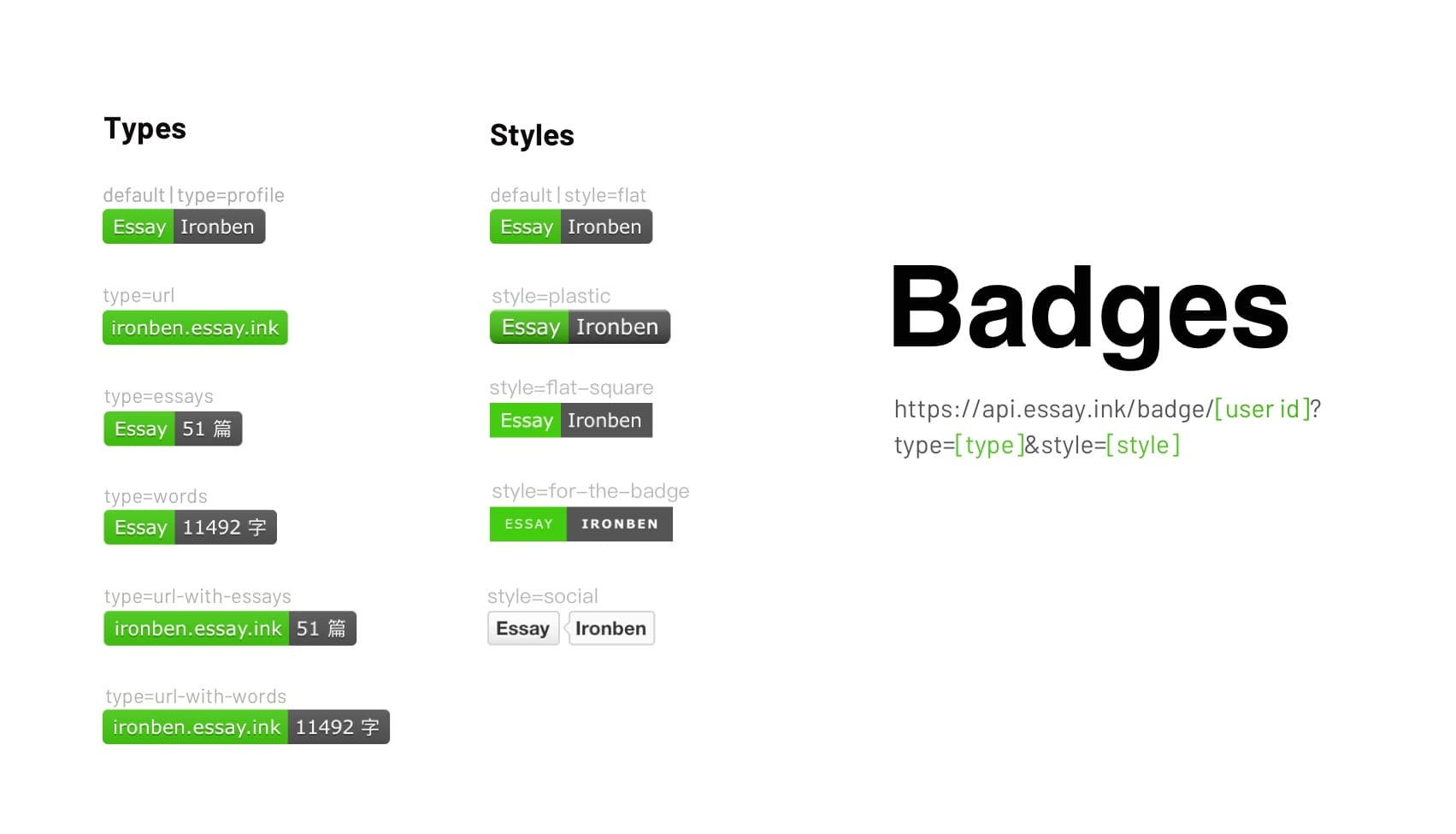 https://api.essay.ink/badge/[user id]?type=[type]&style=[style]