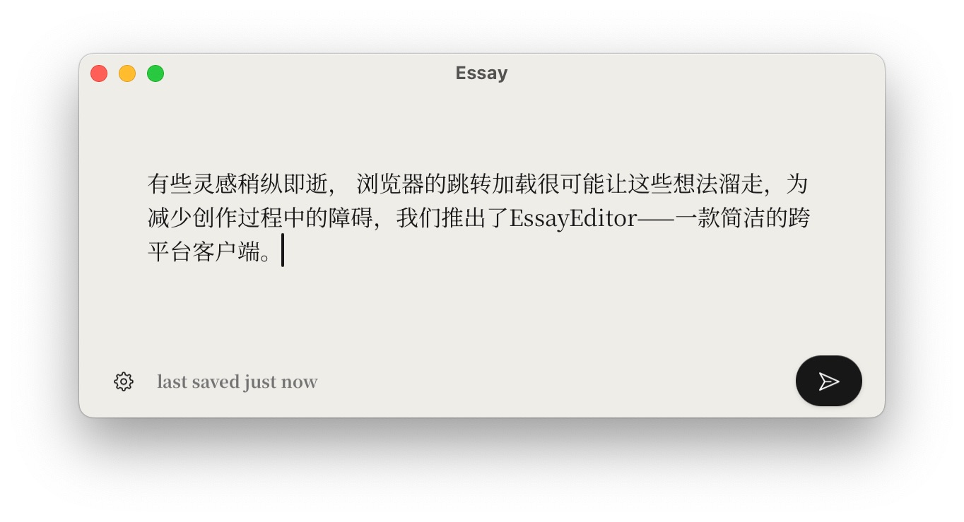 近期我们对 Essay 做了一些细节优化和除虫,并推出了全新的客户端——EssayEditor。 我们不知道什么时候一个灵感会突然闪现,但当他它出现时,我们总希望能抓住它。EssayEditor 作为一款本地应用,免去了等待网页跳转加载的流程,让创作体验更流畅。